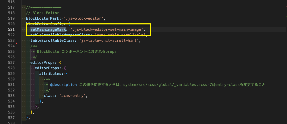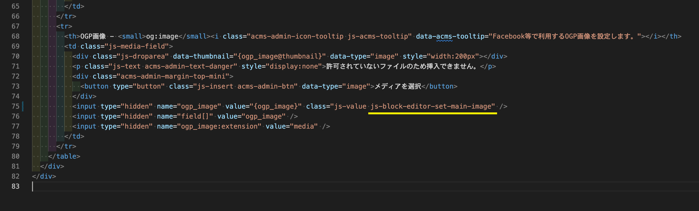 ここで指定されているクラス名 js-block-editor-set-main-image を、テーマ内の admin/entry/field-seo.html にあるOGP画像の値を保持するための input 要素のクラスに付与します。