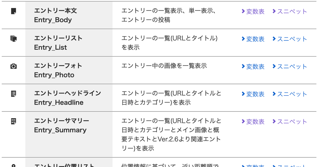 例えば、エントリーサマリーというモジュールを使用した場合、エントリー(投稿ページ)のインデックスの一覧が表示できるようになります。