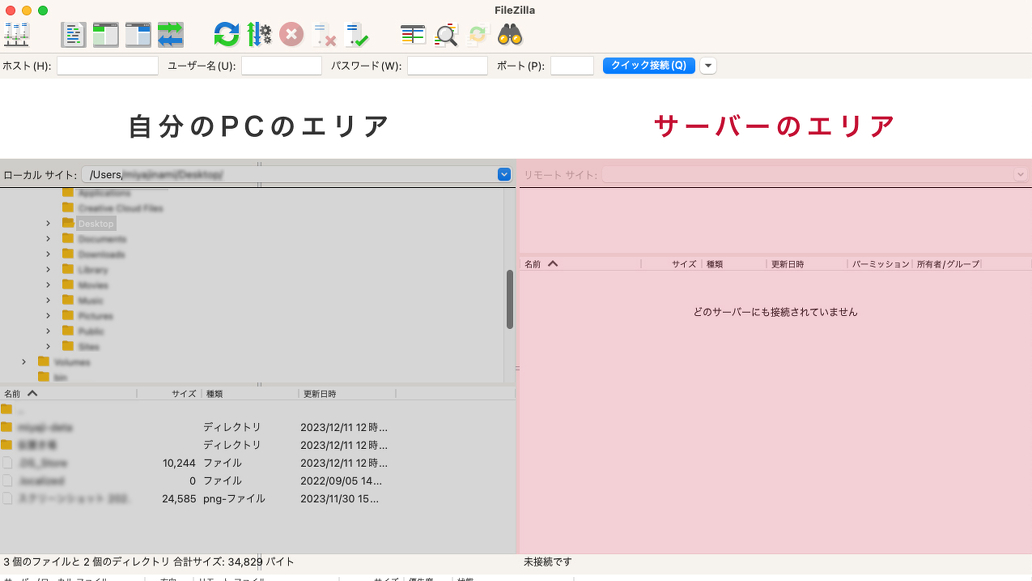 左側が自分のPC、右側がサーバーのエリアです。