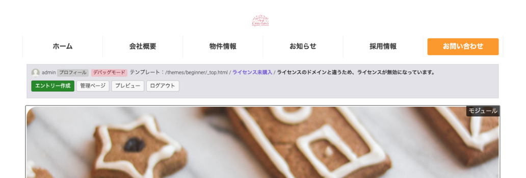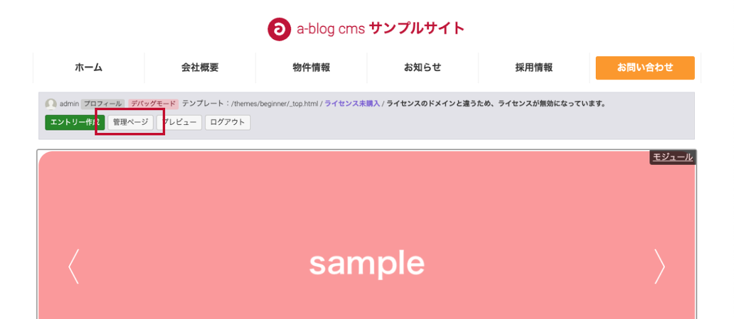ログインできたら、スライダーの上に設置してある、「管理ページ」ボタンをクリックします。