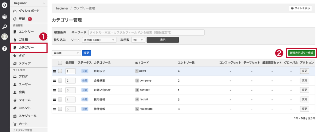 左側のメニュー「カテゴリー」をクリックし、緑色の「新規カテゴリー作成」ボタンをクリックします。