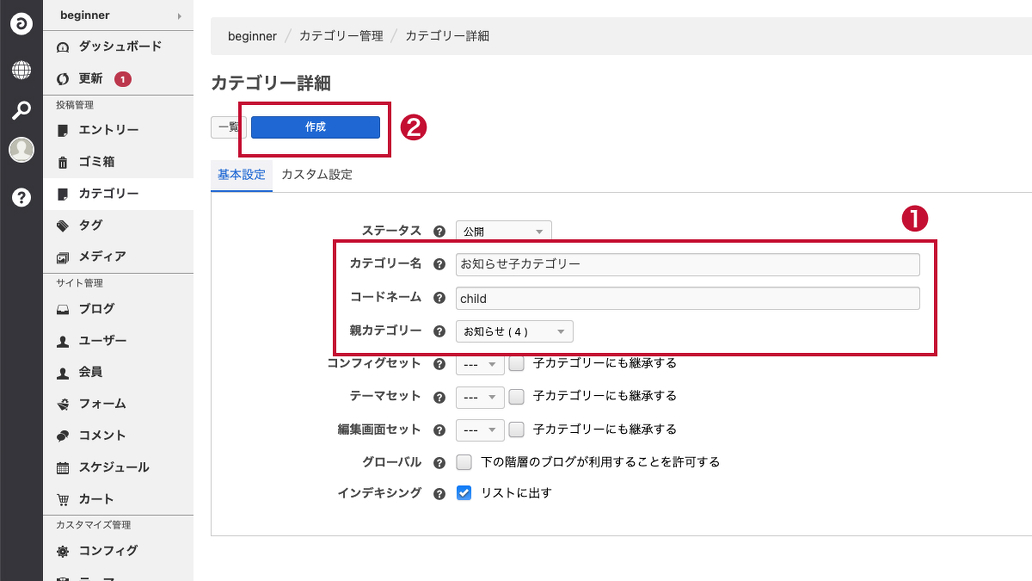 カテゴリー名・コードネームを適当に書いて、親カテゴリーは「お知らせ」を選択します。