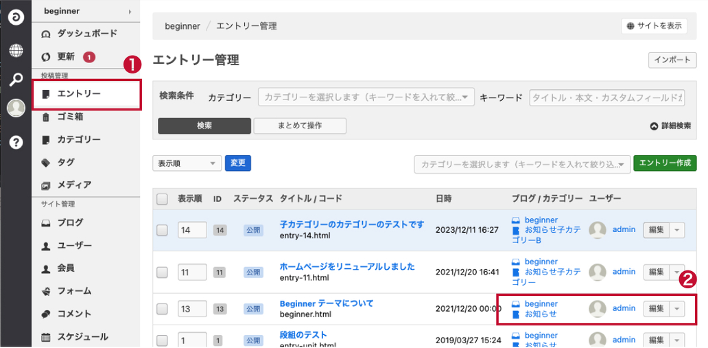 サイドメニューのエントリー>エントリー一覧>該当するエントリーを「編集」ボタンでエントリー編集画面に行くことができます。