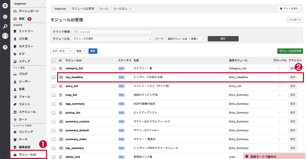管理画面左側のメニュー「モジュールID」をクリックし、トップページお知らせ用モジュールの「設定」ボタンをクリックします。