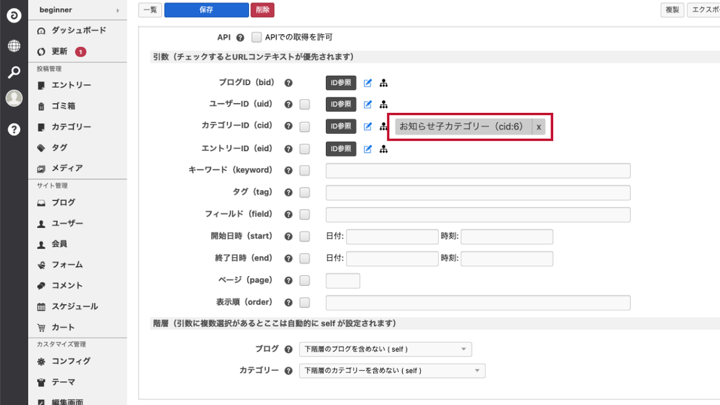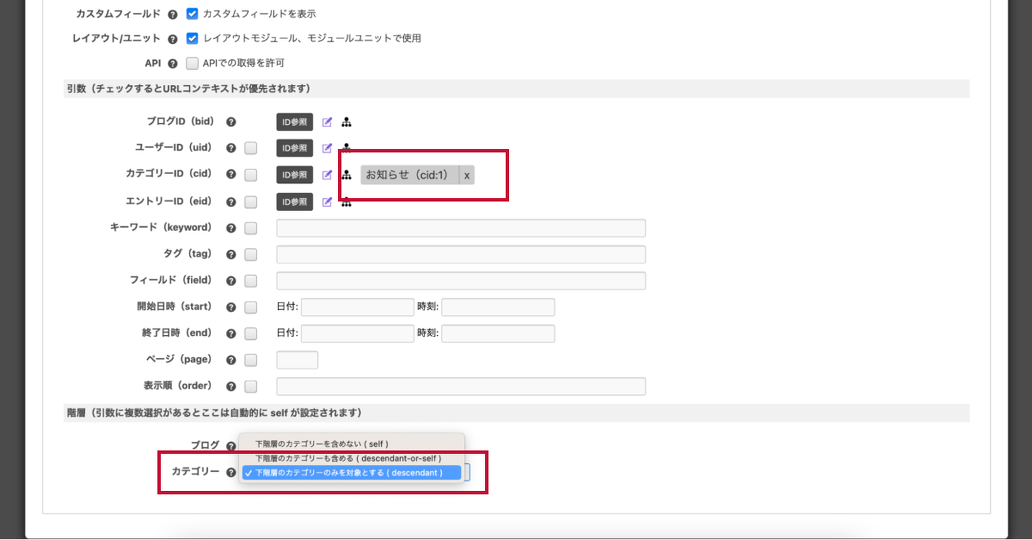 引数は「お知らせ」のままで、階層のカテゴリーを「下階層のカテゴリーのみを対象とする」にすればいい