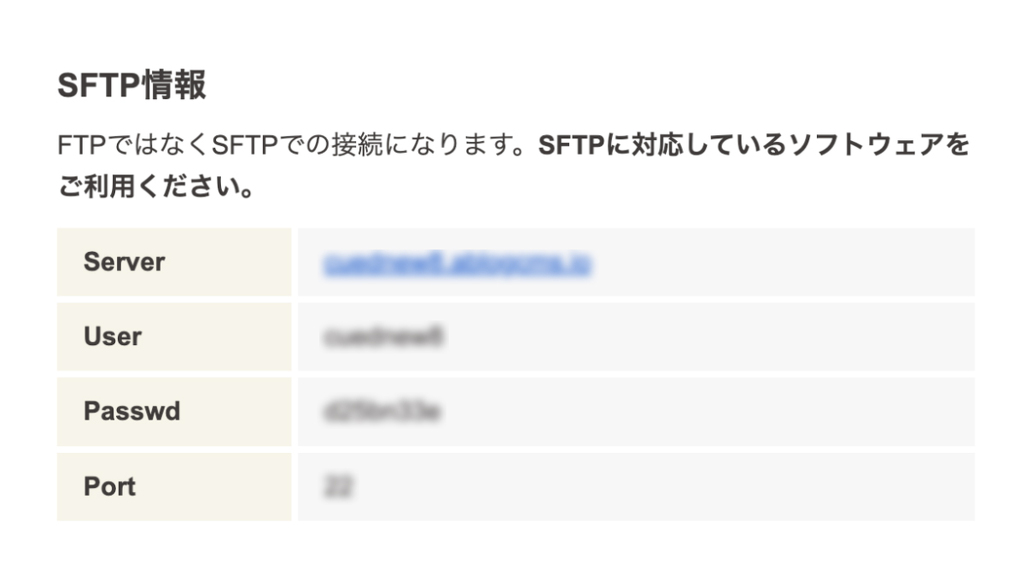 テスト環境構築フォームに入力したメールアドレスに、ablogcms.ioからのメールが届いているはずなので確認します。すると、SFTP情報というものが記載されています。