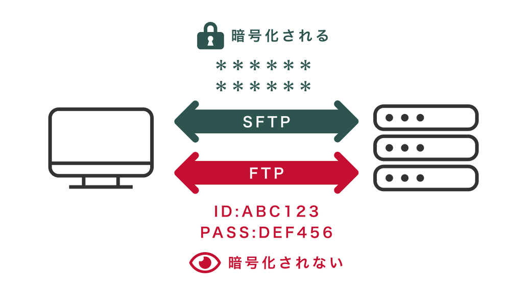 SFTPもFTPもファイルを送受信する仕組みですが、SFTPは情報を暗号化して送受信するので、FTPより安全みたいです。