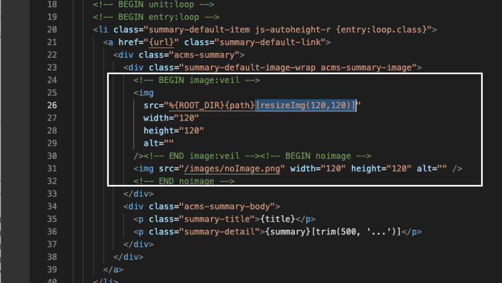 16:9の比率にしたいので、ここを[resizeImg(213,120)]に変更してみます。widthも同じように213に変更します。ついでにnoImageのサイズも変更しておきましょう。