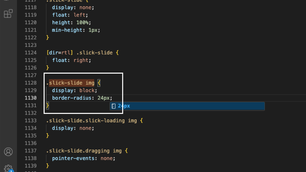 丸角にしたいので、クラス名slick-slide imgにborder-radius: 24px;を追記して保存。