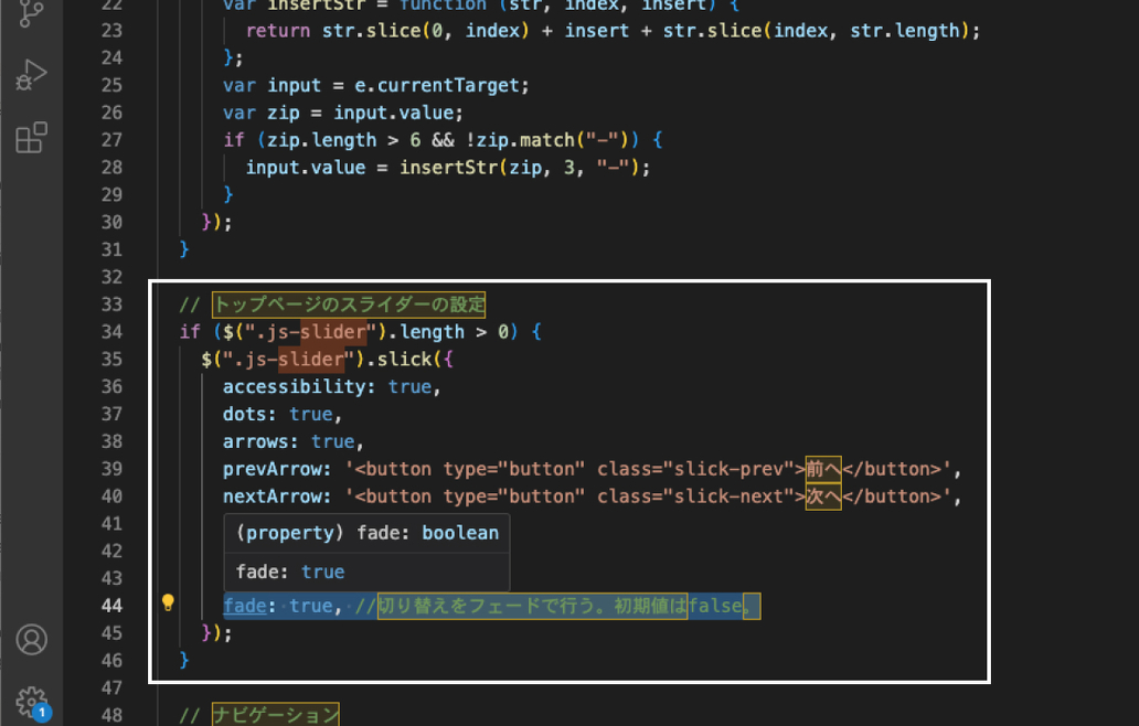 「// トップページのスライダーの設定」のところにfade: true,を追加し保存し、このindex.jsをドラッグして、サーバーにあるindex.jsに上書きします。